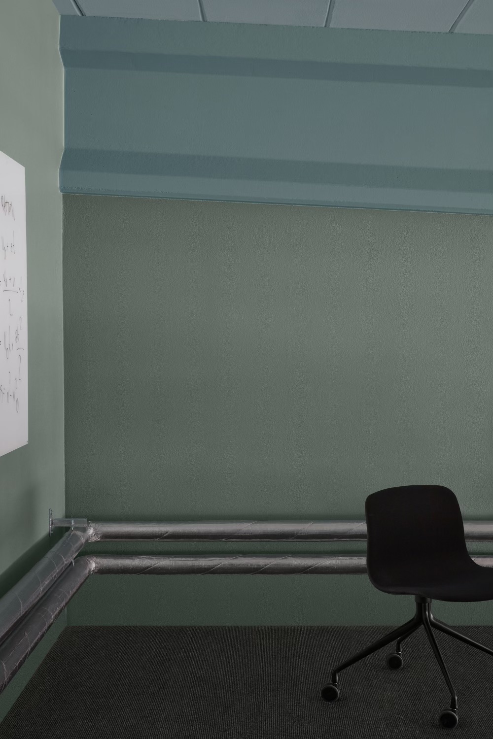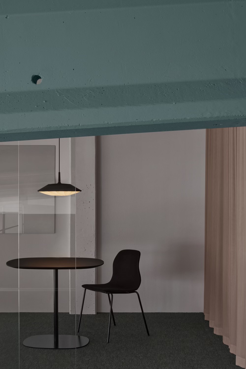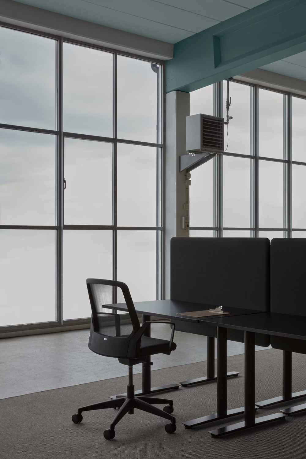 The space is defined by robust concrete beams – a nod to the building’s storied past. A distinctive blue-green hue, inspired by the chemical reaction of salt on untreated concrete, adorns the thick ceiling beams, reconnecting the renovated space with its historical narrative. The result is an elegant, inviting office that honors its heritage while looking boldly forward.