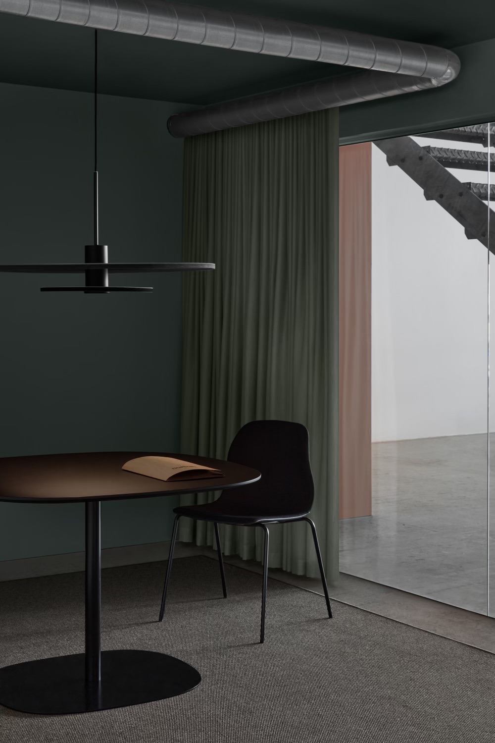 The interior highlights the fusion of raw industrial features with refined design touches. The interplay between the exposed ventilation ducts and galvanized steel staircase with the soft textiles and nuanced color scheme creates a workspace that is both playful and polished, balancing bold colors with the industrial charm of the structure.